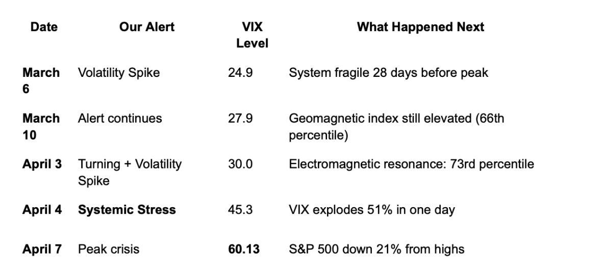 We flagged it because our environmental indices — tracking geomagnetic activity, solar flux, and atmospheric conditions from NOAA and NASA — showed readings that historically correlate with market fragility.