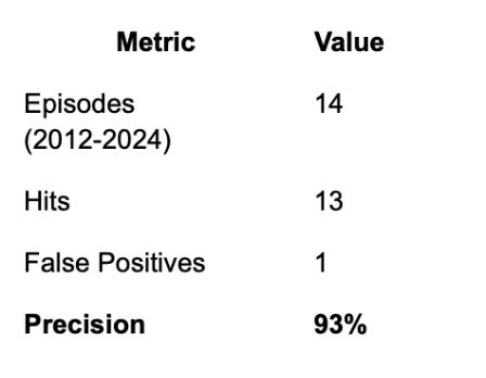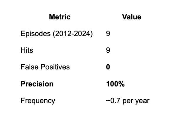 100% precision on crisis-grade conditions (9 for 9, 2012–2024 historical backtest)