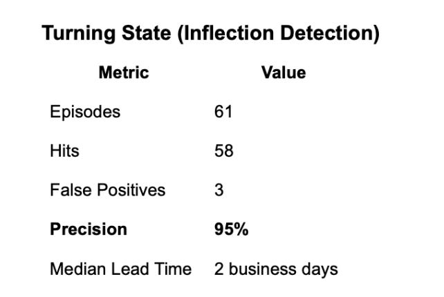 95% precision on inflection points (58 of 61, 2012–2024 historical backtest)